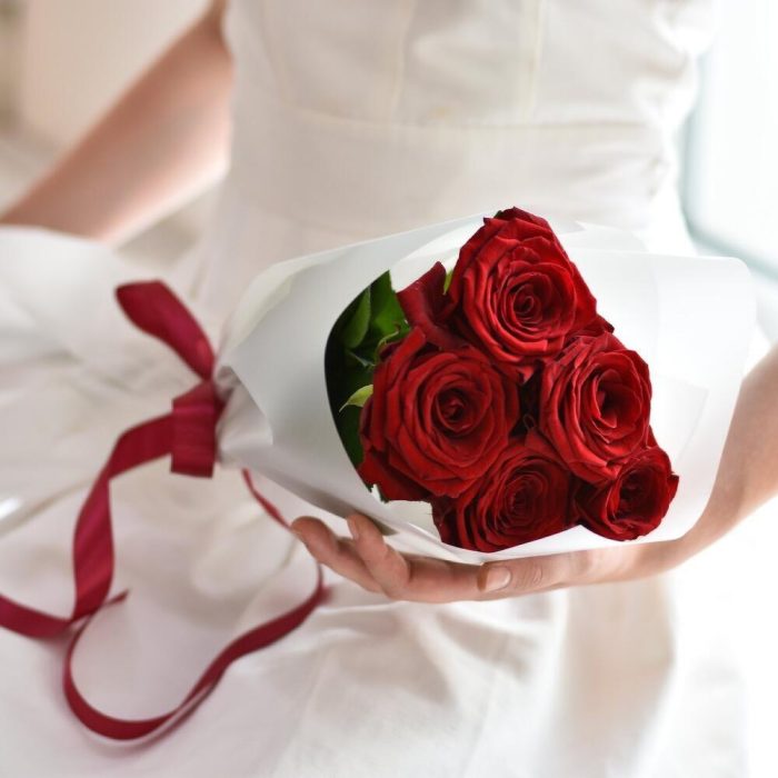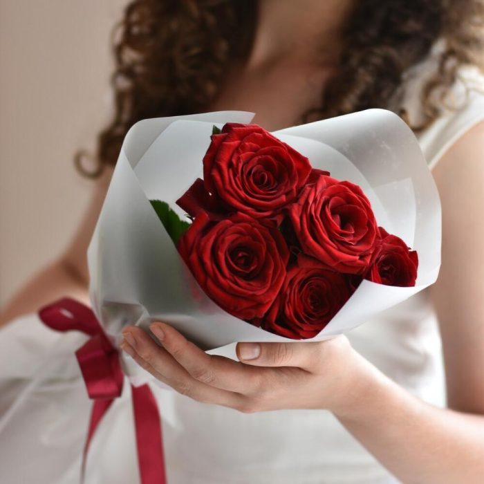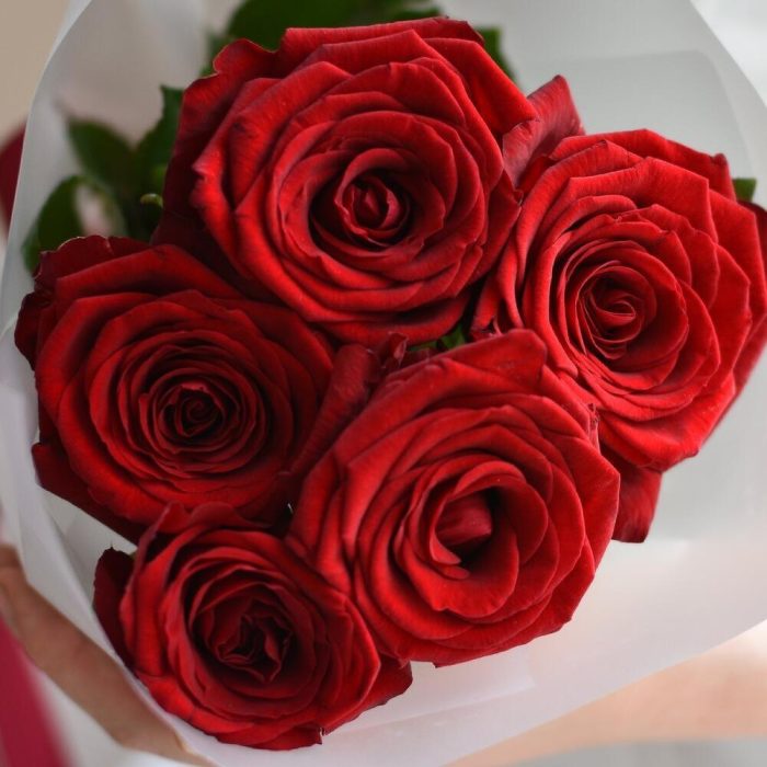 Роза красная – 5 шт. Открытка – 1 шт. инструкция по уходу за цветами – 1 шт. Упаковка дизайнерская – 1 шт.