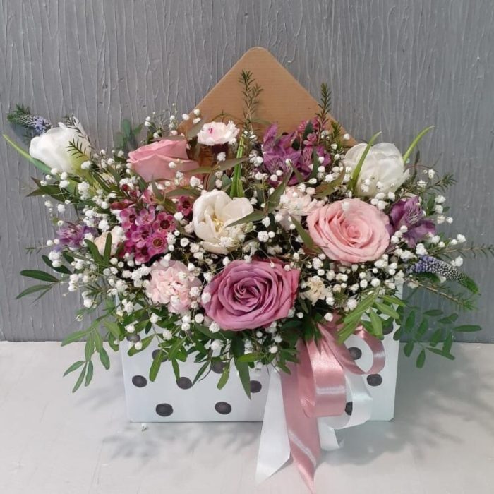 Свежие цветы в конверте, внутри которого флористическая губка с водой не требуют полива и вазы.Чудесный и очень позитивный весенний конверт!