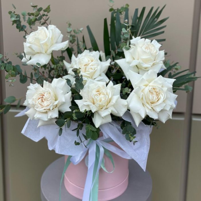 Роскошная коробка с белыми розами и зеленью Воздушная,нежная композиция с большим количеством зелени и белыми сортовыми розами
