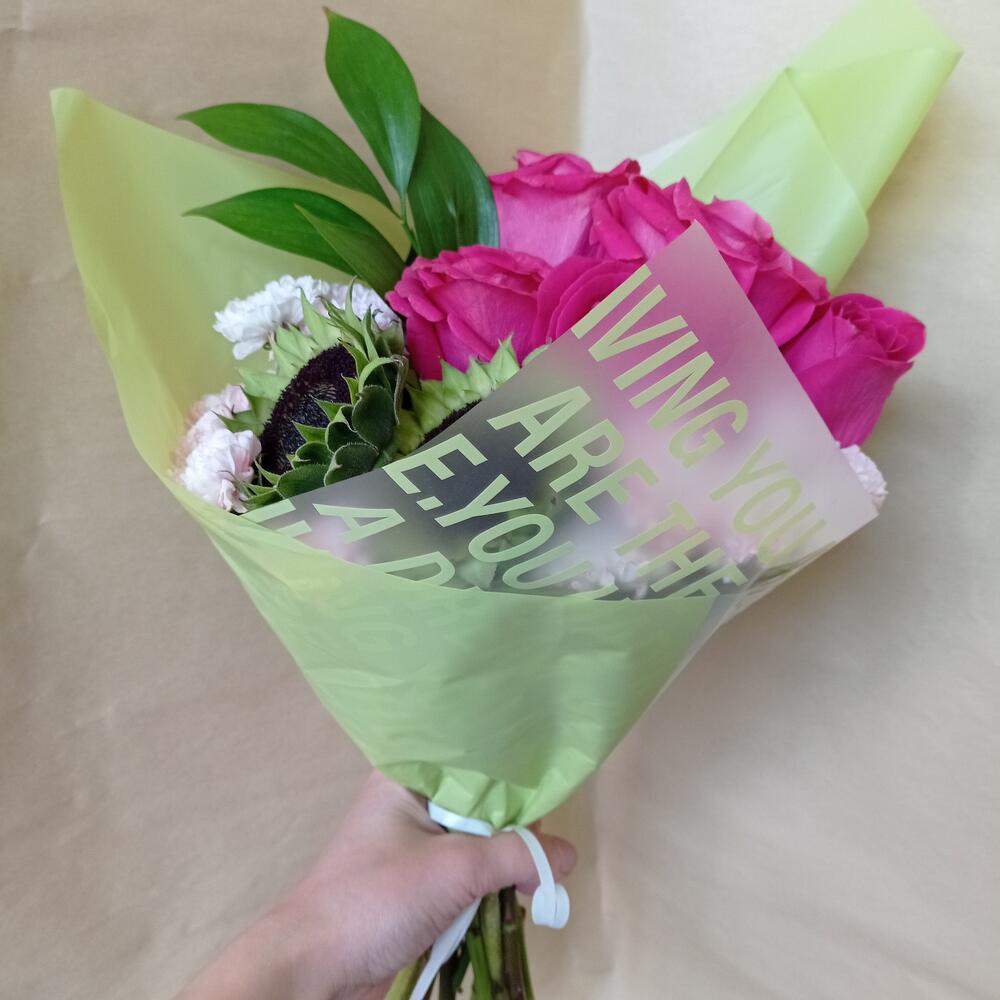 Роза – 5 шт.Зелень – 1 шт.Лента атласная – 2 шт.Подсолнух – 2 шт.Упаковка дизайнерская – 1 шт.хризантемы – 5 шт.