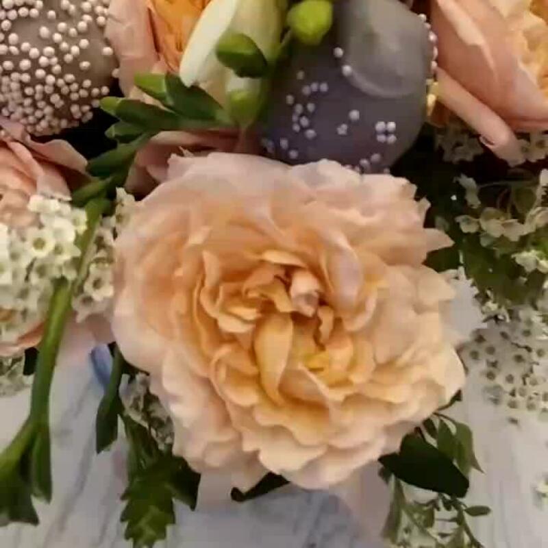 Букет с пионовидными розами, хлопком и ягодами «Персик»