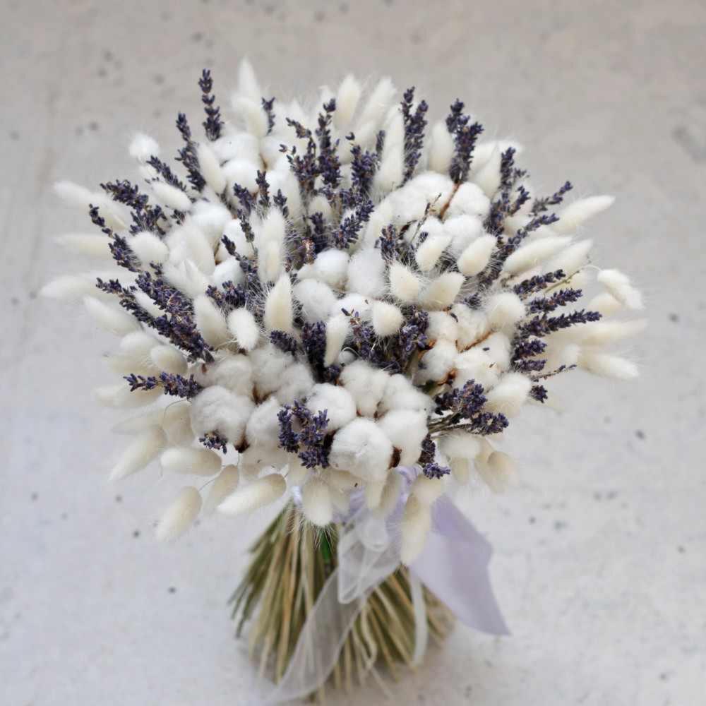 Хлопок – 6 шт.Лаванда – 45 шт.Лагурус – 51 шт.Лента атласная – 1 шт.