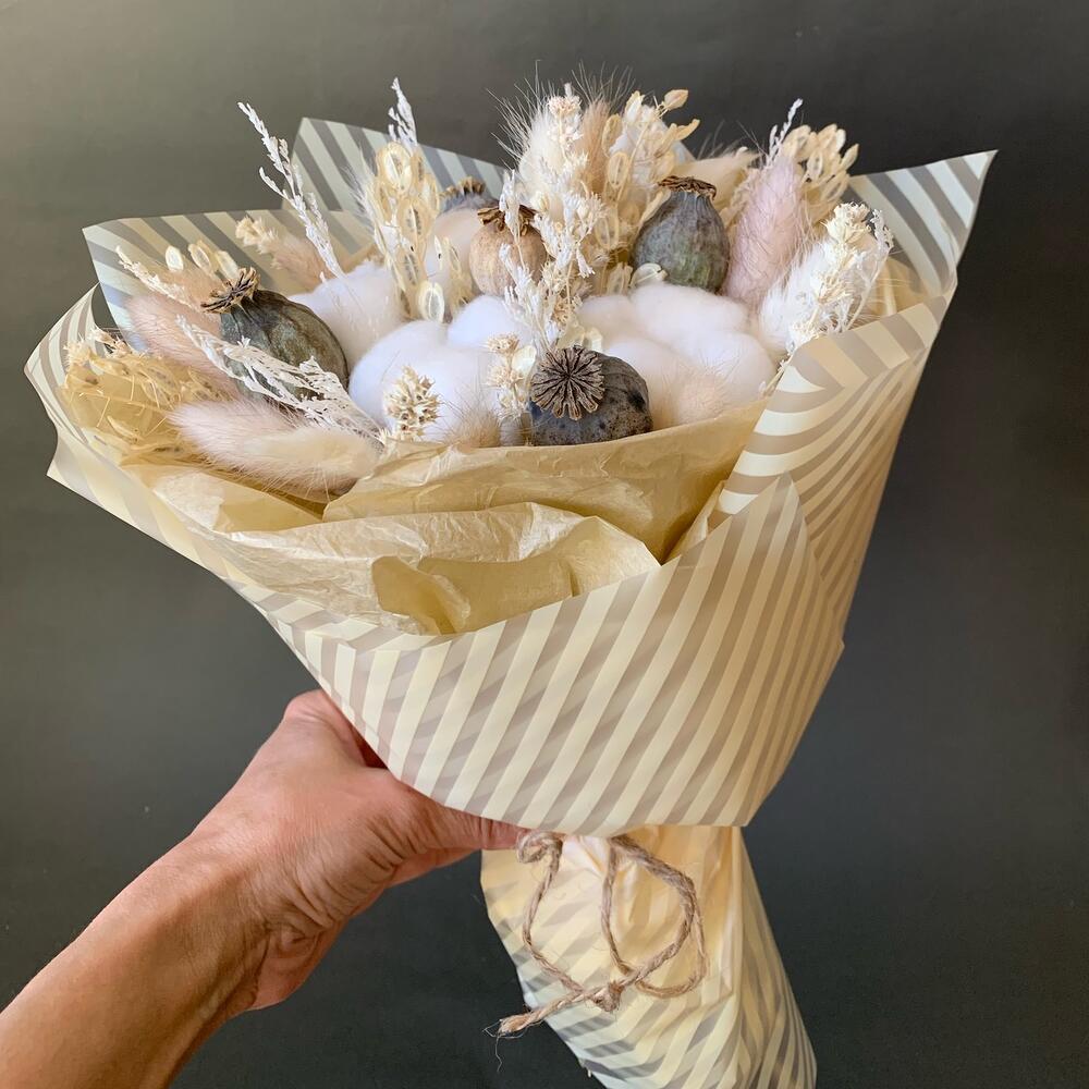 Хлопок – 5 шт.мак декоративный – 5 шт.Лагурус – 15 шт.шандра – 2 шт.Лимониум – 1 шт.Ярутка – 5 шт.Тишью – 1 шт.Пленка матовая – 1 шт.бечевка натуральная – 1 шт.